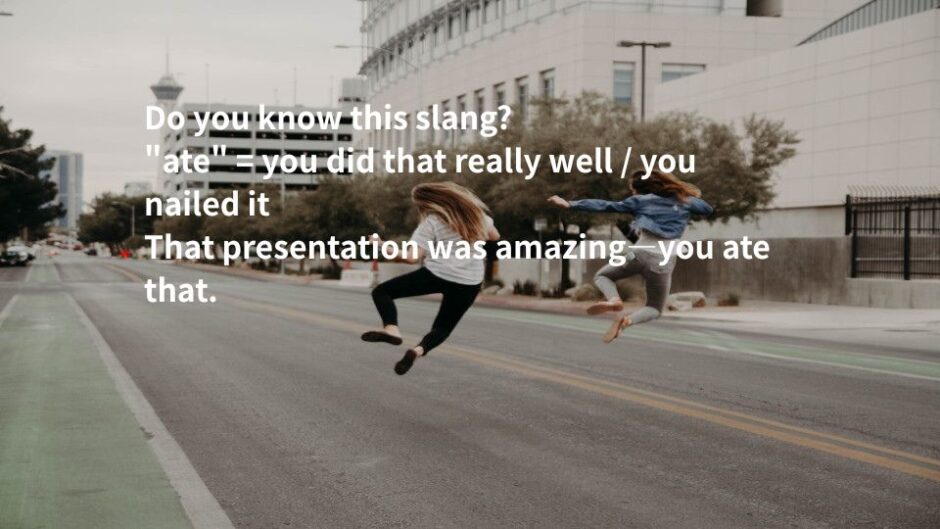 「ate」のような表現は、まとめて覚えると会話で使いやすくなります。ネイティブがよく使うスラングは「英語スラング一覧50選」で一覧で紹介しているので、あわせてチェックしてみてください。