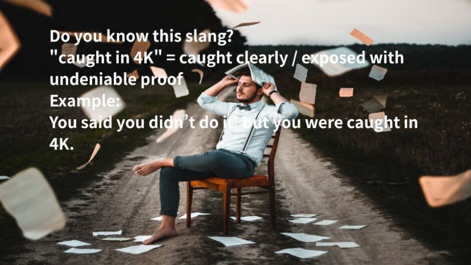 「caught in 4K」のような表現は、まとめて覚えると会話で使いやすくなります。ネイティブがよく使うスラングは