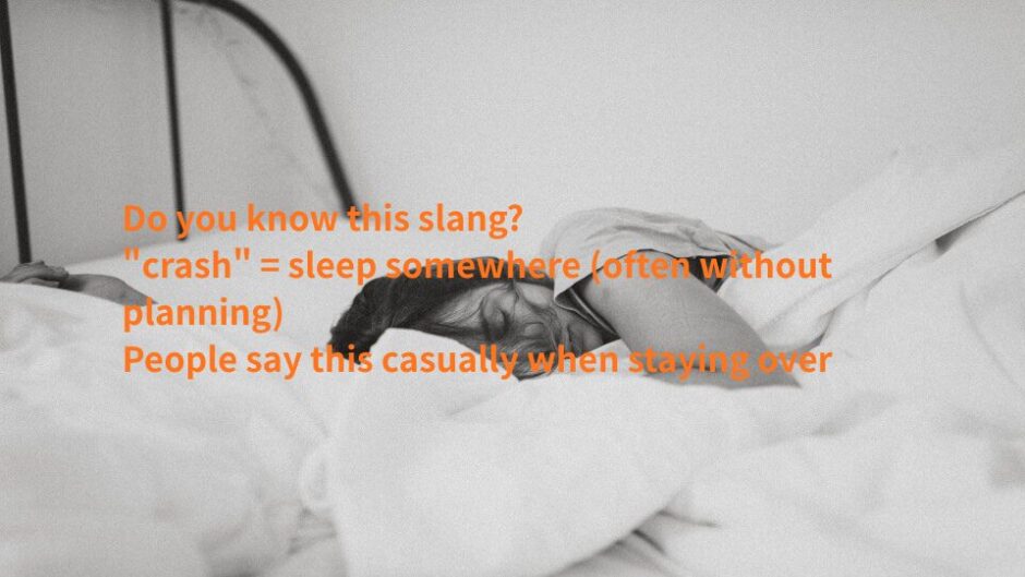 「crash」のような表現は、まとめて覚えると会話で使いやすくなります。ネイティブがよく使うスラングは「英語スラング一覧50選」で一覧で紹介しているので、あわせてチェックしてみてください。