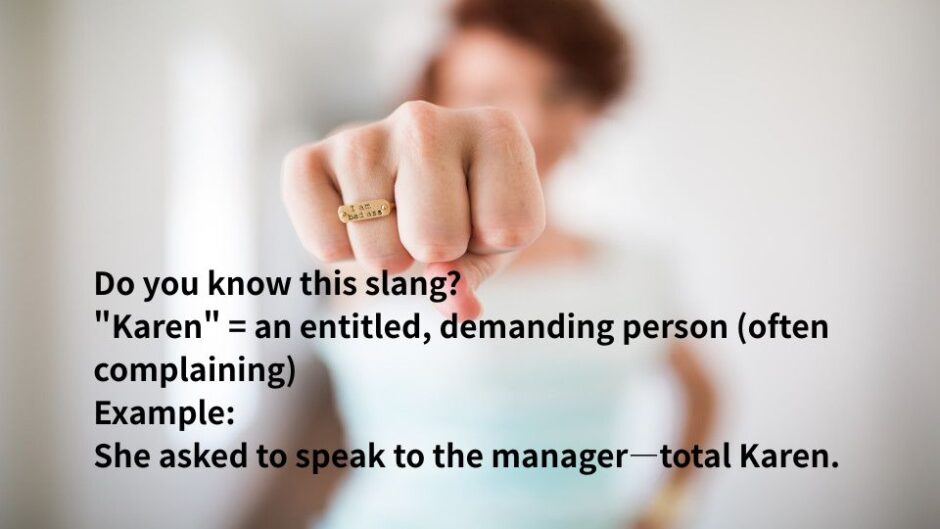 「Karen」のような表現は、まとめて覚えると会話で使いやすくなります。ネイティブがよく使うスラングは「英語スラング一覧50選」で一覧で紹介しているので、あわせてチェックしてみてください。
